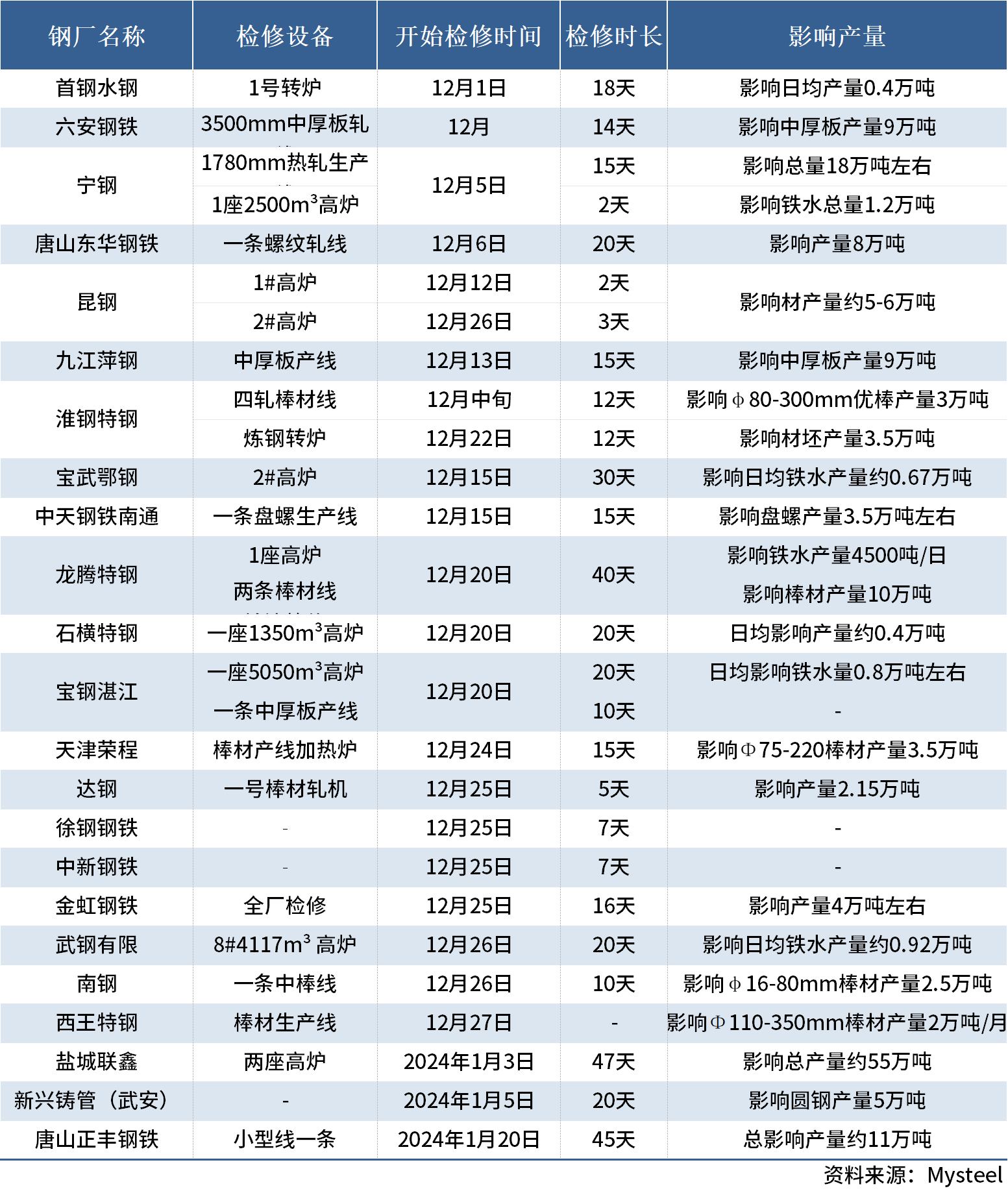 據(jù)Mysteel不完全統(tǒng)計(jì),截至12月27日,國(guó)內(nèi)23家鋼廠發(fā)布檢修信息。其中,金虹鋼鐵計(jì)劃于2023年12月25日-2024年1月9日起全廠檢修,為期16天,預(yù)計(jì)影響產(chǎn)量4萬噸左右。